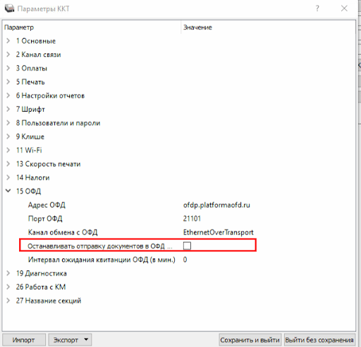 - Убедитесь, что в графе Останавливать отправку документов в ОФД не стоит галочка.