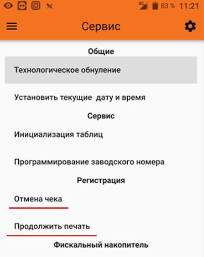 4. Нажмите на кнопку Продолжить печать или Отмена чека. В зависимости от текущего состояния устройства сработает одна из кнопок.