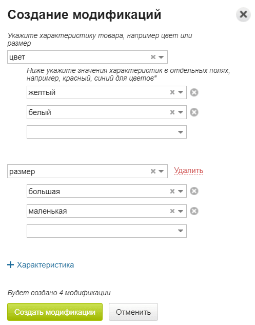 Если товар представлен в двух размерах и двух цветах, автоматически будет создано 4 модификации. Лишние модификации можно удалить, нажав на крестик в конце строки.