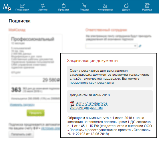 В качестве реквизитов в закрывающих документах будут использоваться данные, которые вы указали на странице Подписка. Если реквизиты не заполнены, то по реквизитам плательщика в случае перевода на расчетный счет.